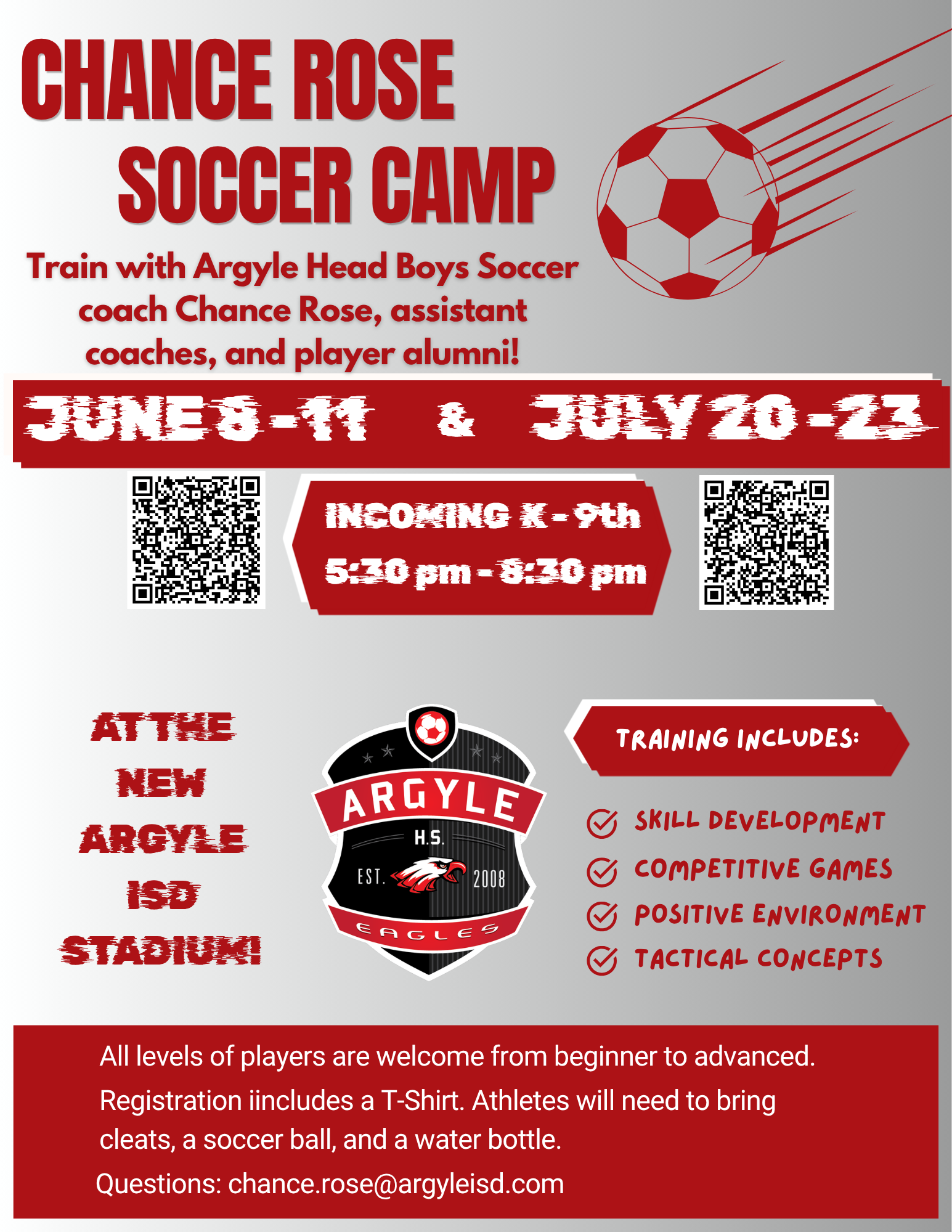 | DESC: | Grades: 1-4, 8:00-9:30 am Grades: 5-7, 10:00 -11:30am Grades: 8-9, 6:30pm-8:30 pm Registration and Payment Link Pending *Argyle ISD has adopted a policy for waiving fees for students who are unable to pay the fees. Contact Kelli Perkins if you believe your family qualifies. |